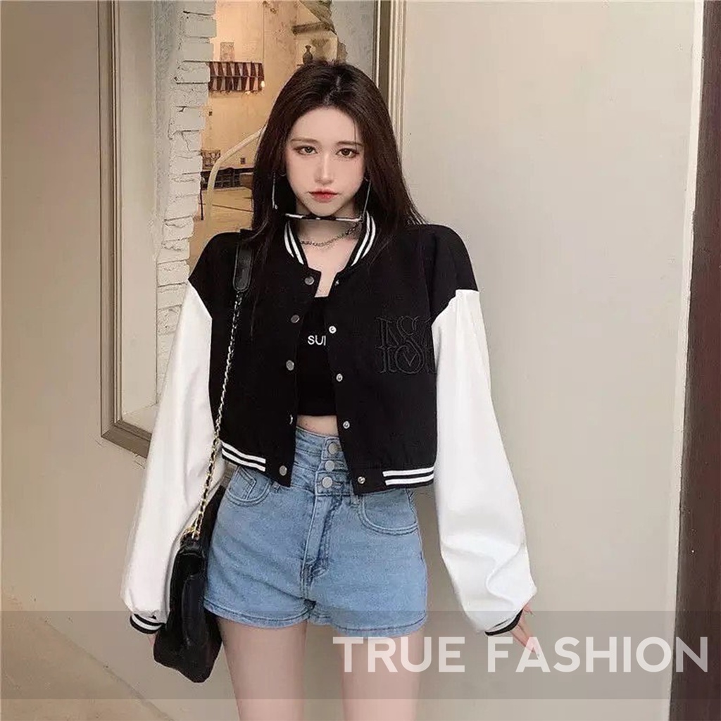 Jaket Baseball Crop Wanita - Bahan Fleece - Allsize - Varsity Jacket